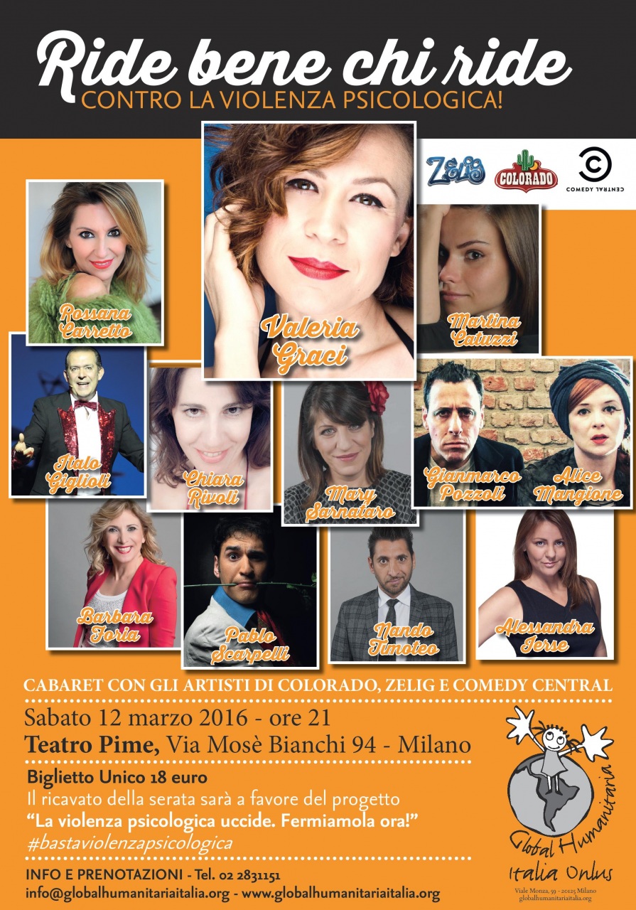 Al Teatro Pime di Milano il 12 marzo va in scena uno spettacolo di cabaret con l’attrice e imitatrice Valeria Graci e altri artisti a favore del progetto “La violenza psicologica uccide. Fermiamola ora!” promosso da Global Humanitaria Italia Onlus e...