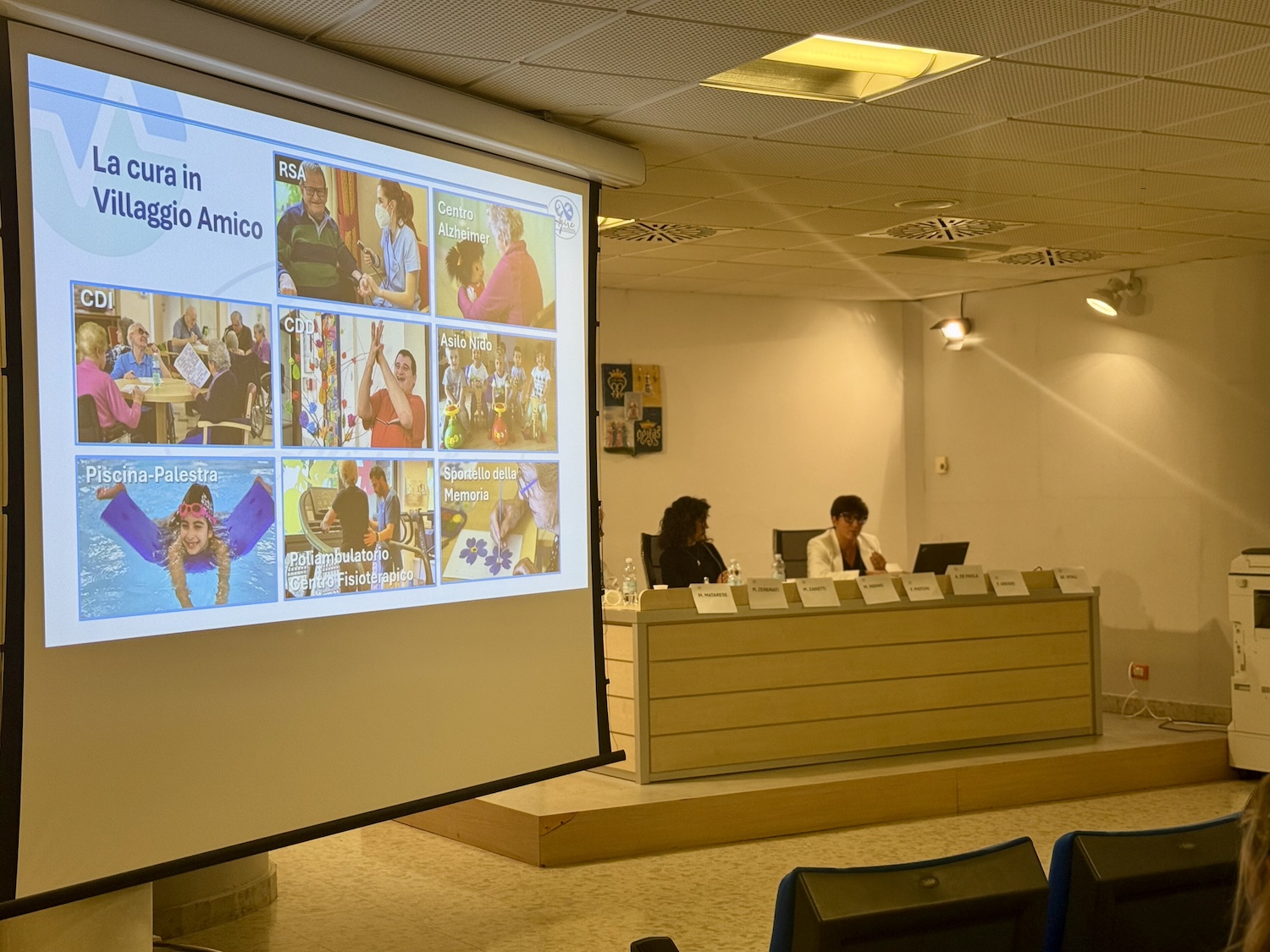Sono stati poi condivisi dati significativi sul numero di persone accolte, sui servizi offerti da Villaggio Amico e sulle modalità di accoglienza, con un’enfasi particolare sull’importanza della formazione continua per il personale e il coinvolgimento attivo delle famiglie. Coinvolgimento che avviene anche attraverso le tantissime attività che la comunità sanitaria organizza sul territorio come Comunità amica delle persone con demenza, tra cui formazione sul territorio MMG, farmacie, bambini e ragazzi; valutazioni e screening gratuiti per la prevenzione; eventi e iniziative socio-ricreative per persone con demenza e famiglie.
