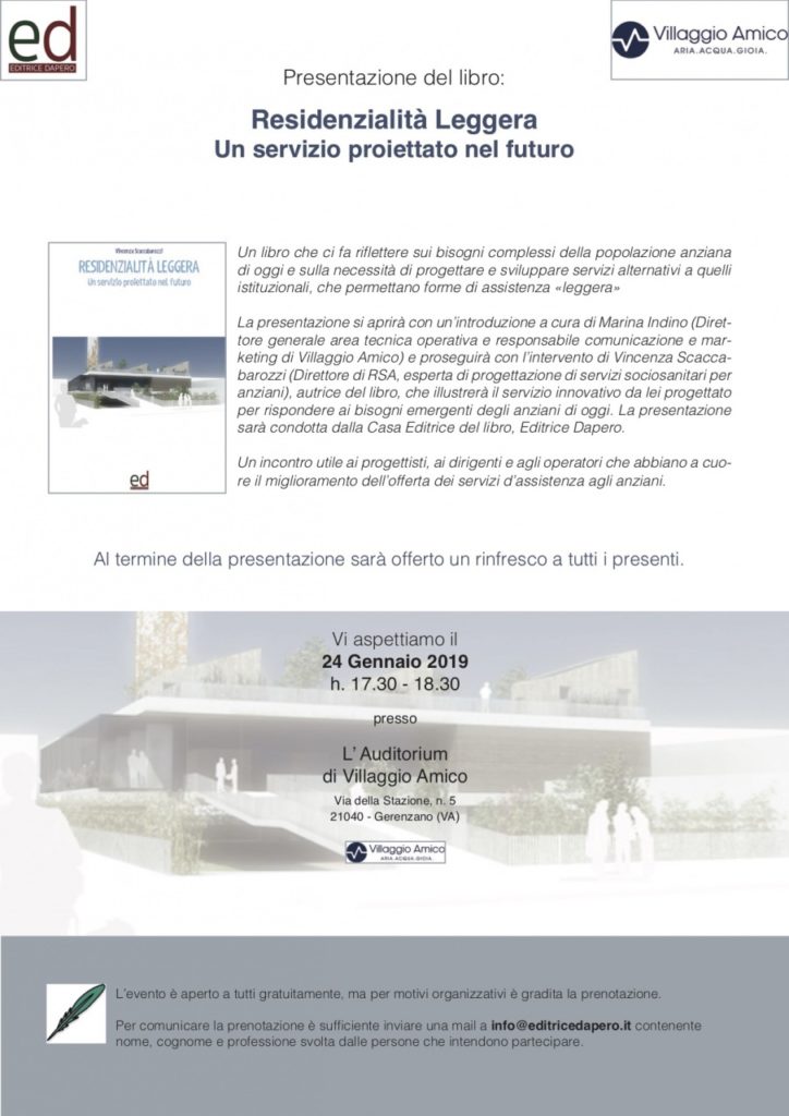 Milano, 16 gennaio 2018 – Verrà presentato giovedì 24 gennaio presso l’Auditorium di Villaggio Amico – Residenza sanitaria assistenziale alle porte di Milano – il libro edito dalla casa editrice Dapero "Residenzialità Leggera, Un servizio proiettato nel futuro”, scritto da Vincenza Scaccabarozzi, direttore di Rsa ed esperta in progettazione di servizi sociosanitari per anziani.
